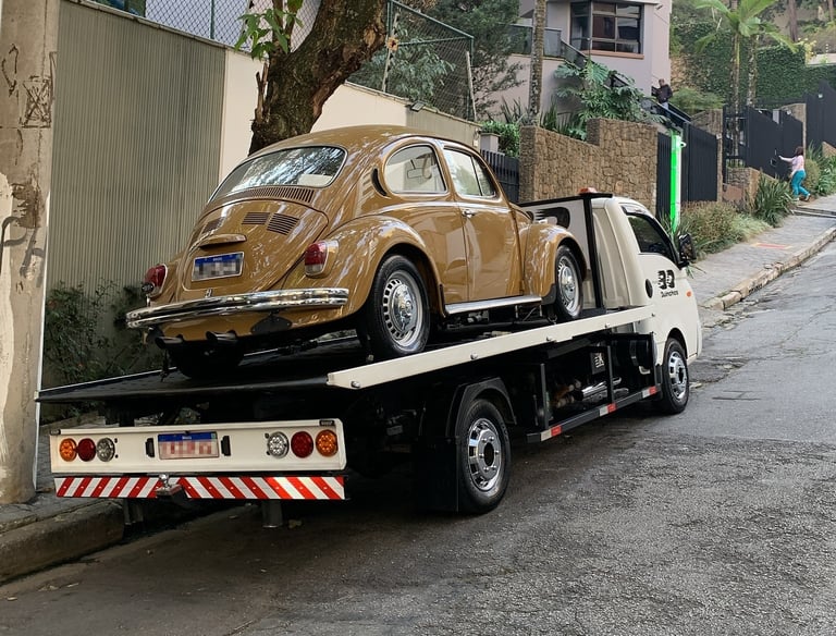 O guincho é adequado para diversos tipos de veículos e o transporte é feito de forma segura e adequada para evitar danos.